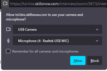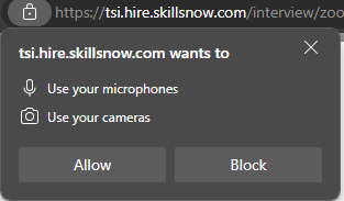 With these three browsers, it will ask permission to use your camera and microphone the first times you try to use it. You must accept these in order to let SkillsNow have access to your devices.