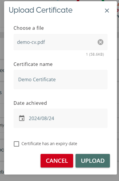 Clicking on this will open the Certificate Upload dialog. Clicking on the 'Choose a File' section will allow you to select a file from your device to upload. You must also add a Name and Date Achieved in order to upload the document.