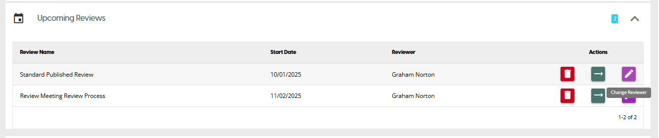 A feature that has been included for review processes is an interface that allows for new reviewers to be assigned to a review process. When viewing a team members upcoming reviews table, there is purple pencil icon in the actions column that