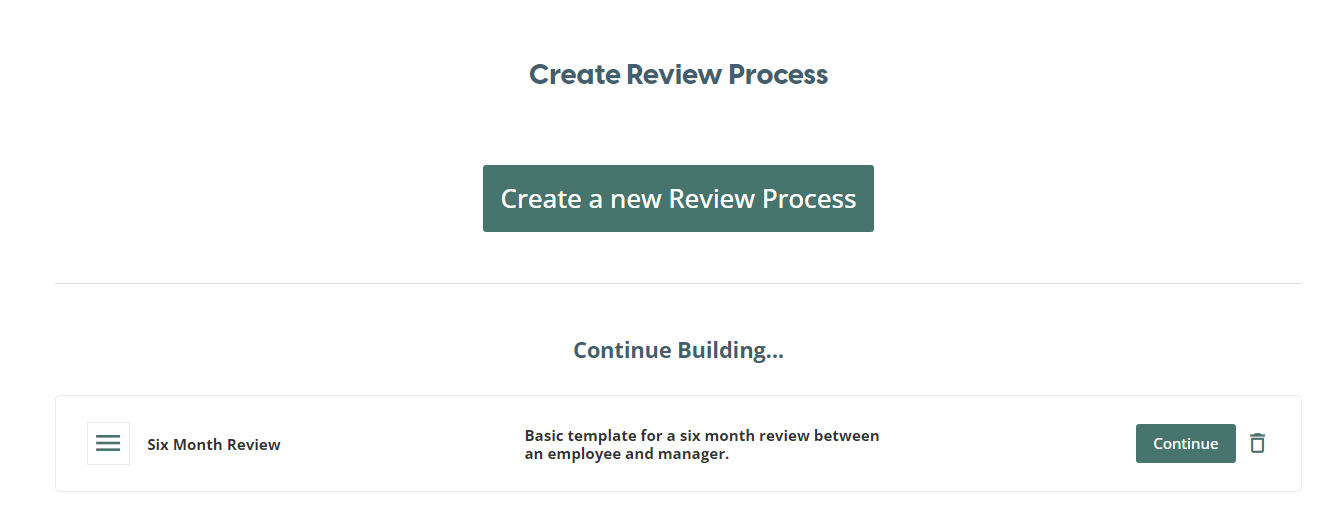 Once on this screen, you can start the Review Process creation process by clicking on 'Create a new Review Process' button or you can continue working on a Review Process in the draft state by clicking the 'Continue' button at any review process in the Continue Building.... list