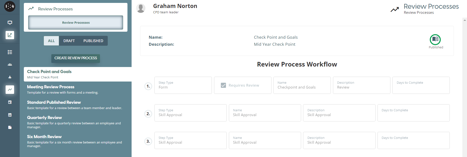 Created Review Process Workflow will be listed on the PUBLISHED tab and will be already for use for Team Review - Review Process. These Review Processes can now be selected to each team member when assigning a new review process.