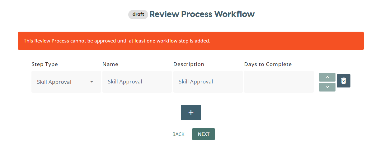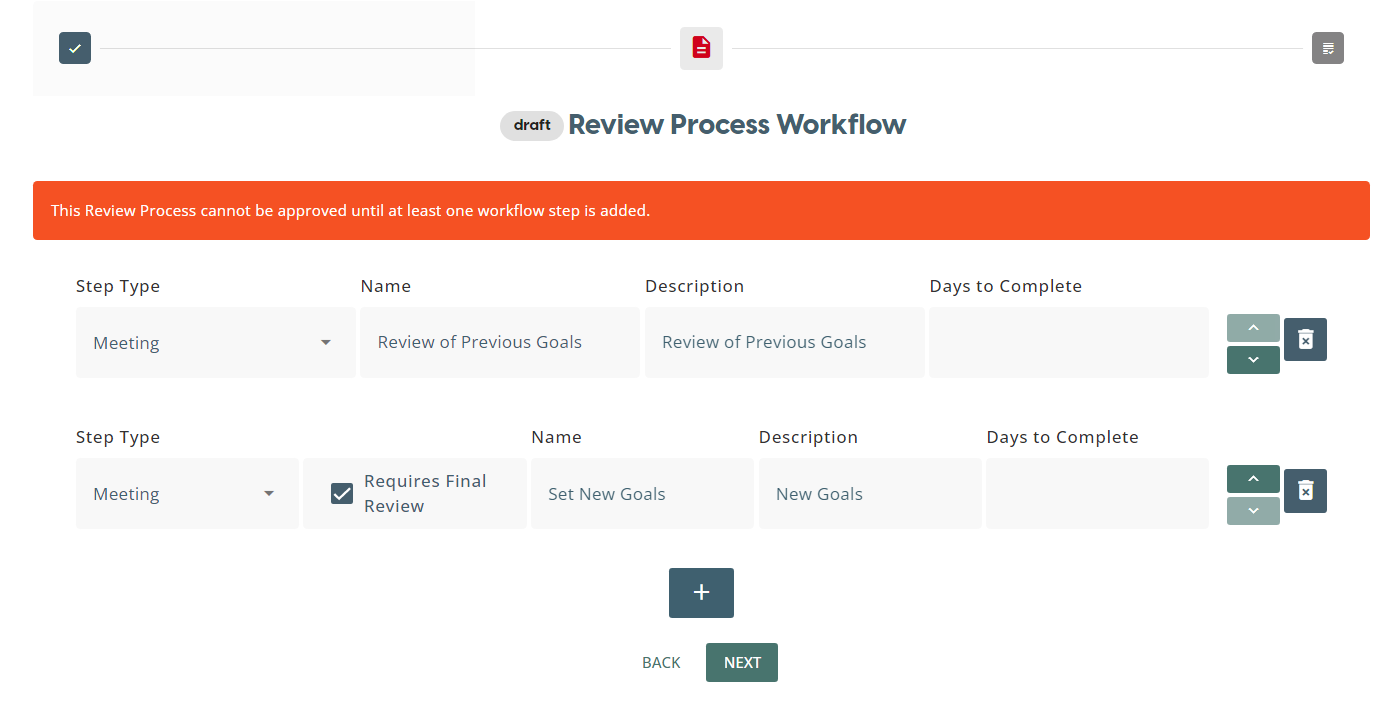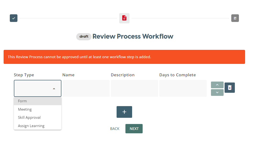 Review Process can be created from a set of Review Step Types which include: Forms, Meeting, Skill Approval, Learning Assignment.