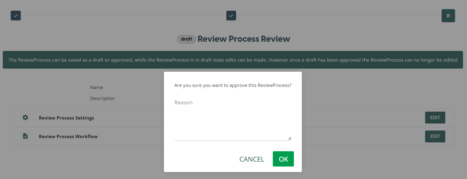 You have the ability to add a reason for publishing, but this is optional. Once you are ready to publish the review process, click OK