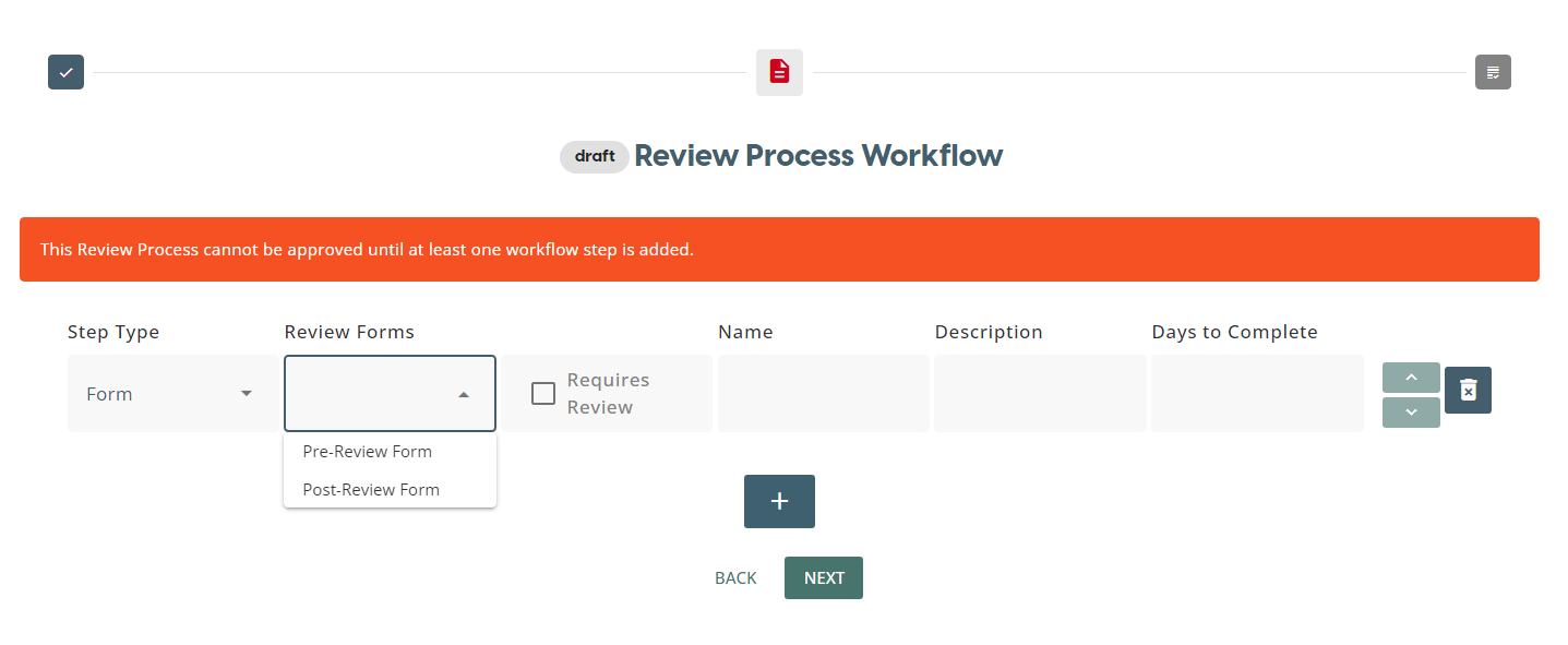 The first step to creating a Review Process is to give it a Name and Description. After clicking one of the buttons to build a review process, this is the first page you will land on. Once you have confirmed these details, click on the Next button to create the workflow for your Review Process.