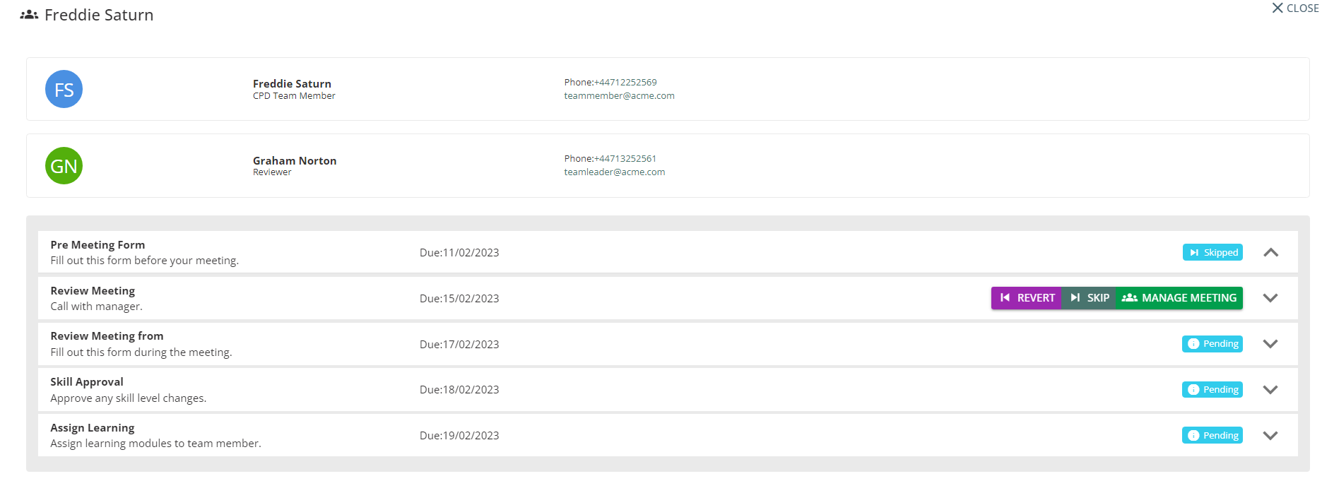 Clicking on this button will open a pop-up box to confirm the choice. Once the choice has been confirmed, the review process will roll back to the previous step. The team members previous submissions will not be removed, and any assigned learning or approved skills will not be reverted.