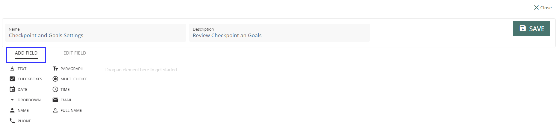 Once in the form builder, you will see several components to help you build a form. Both Name and Description fields are mandatory, as is having at least one form element. To insert a form element, click on any of the element icons in the 'Add Field' tab