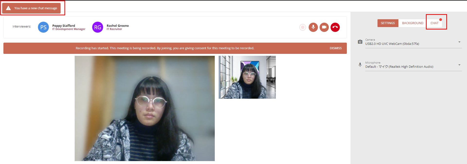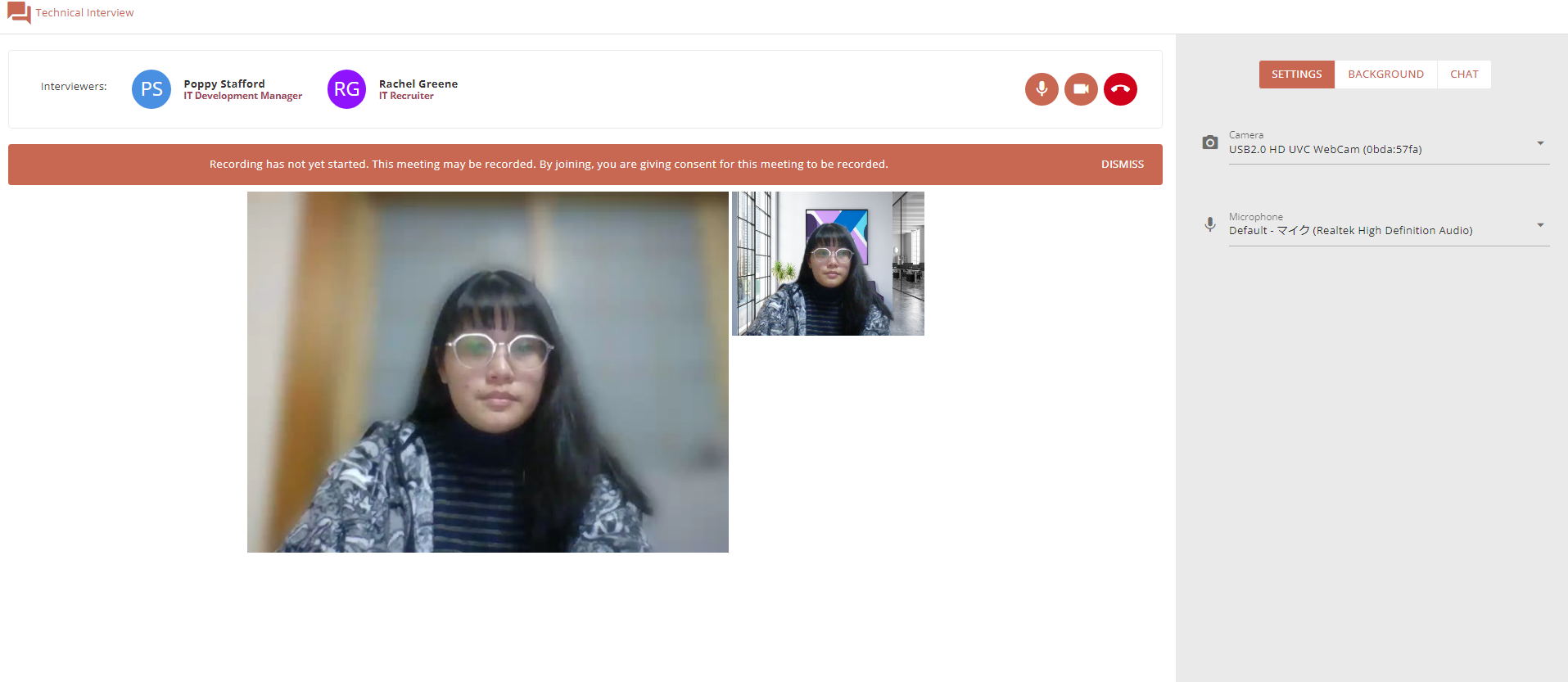 Once you have been let into the interview, you will have a panel of options on the right hand side of the page. Here you have three tabs: Settings for managing your devices, Background for setting your video background, and Chat to send messages to your interviewer.