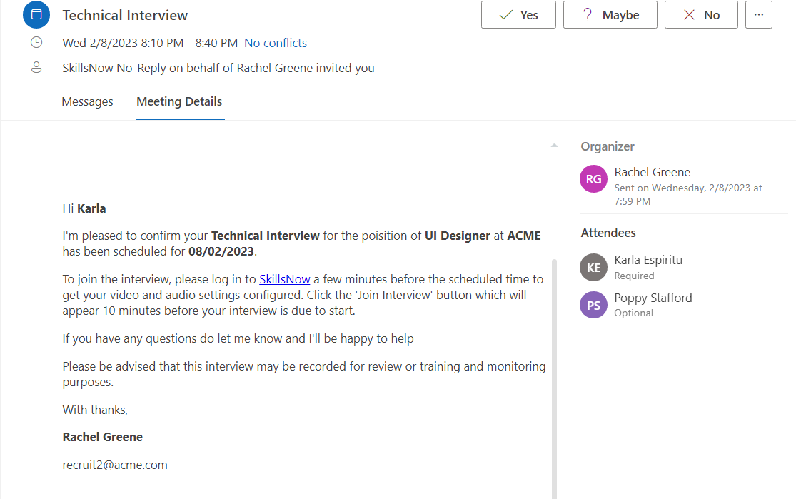 As an applicant, you will receive an email inviting you to your interview session, which will contain an ICS appointment that can be saved to your digital calendar.