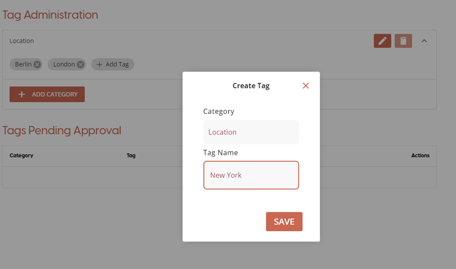 Clicking on the ‘+ Add Tag’ button will open a dialog which allows the user to then creating tags. Once pressing ‘Save’ in the dialog the tag will then be created and associated with that tag category.