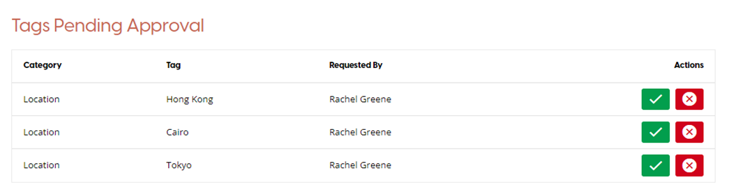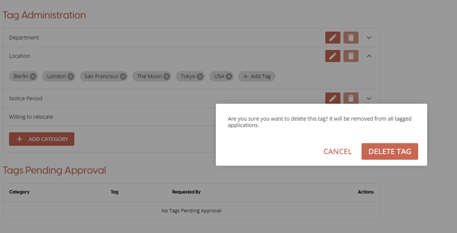 Tags can also be created by other users with the recruiter role, but those tags must be approved by the recruitment admin. Once a tag has been requested by a recruiter it will appear in the Tags Pending Approval section.