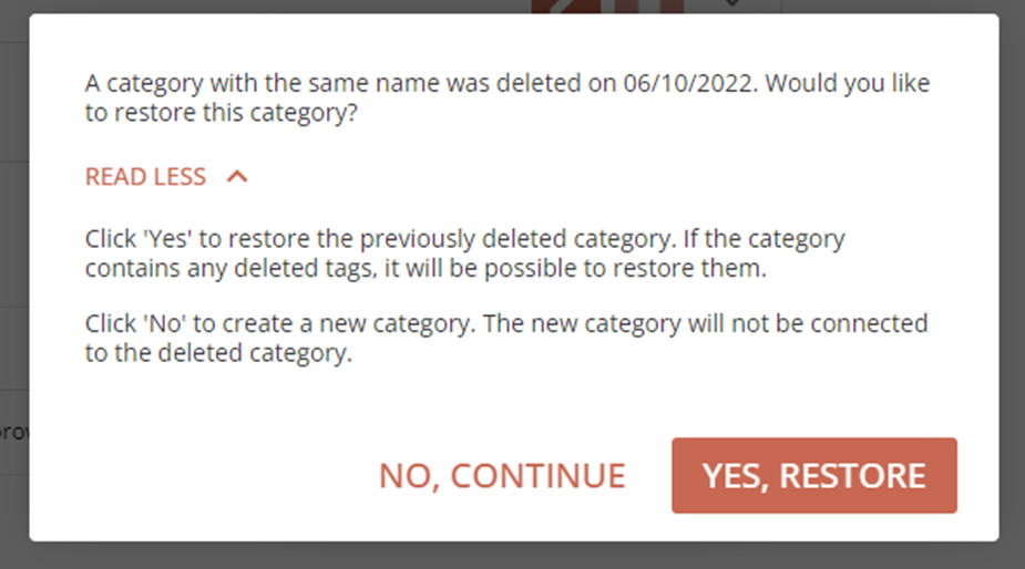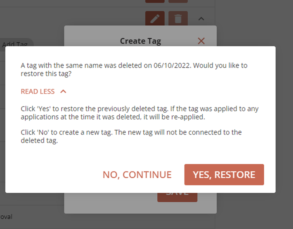 If you attempt to add a Tag with the same name as a previously deleted Tag, the platform will give you an option to restore the tag to its previous status before deletion. A pop-up window will appear giving the user details of each choice and what it means for applications.