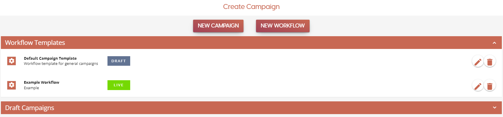 In the campaign editor window, you will see a New Workflow button. Click on this to start the workflow template creation process. If you have a template in the draft state, you can also continue working on it from this page. Click on the WorkFlow Templates ribbon to expand it, and if there is a workflow template in the draft state click on the pencil icon to continue editing it.