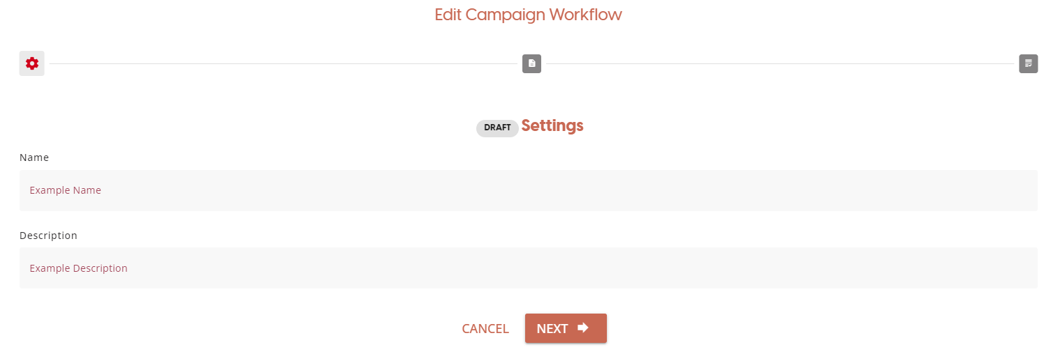 The first page, Settings, will allow you to give your workflow template a name and a description. Once you have filled these out, click on Next to proceed to the next step.