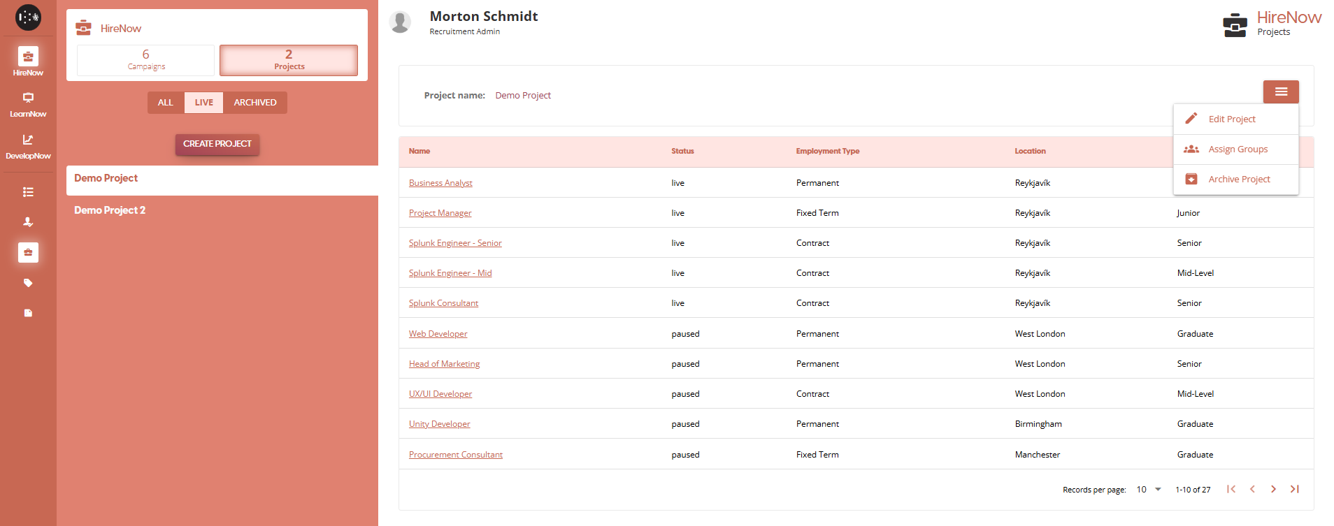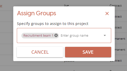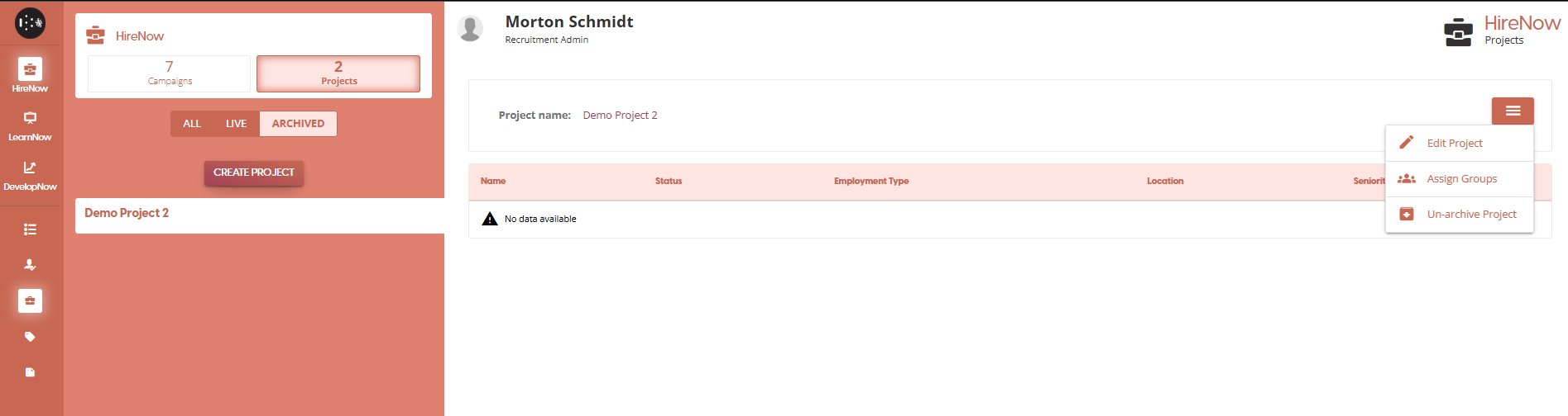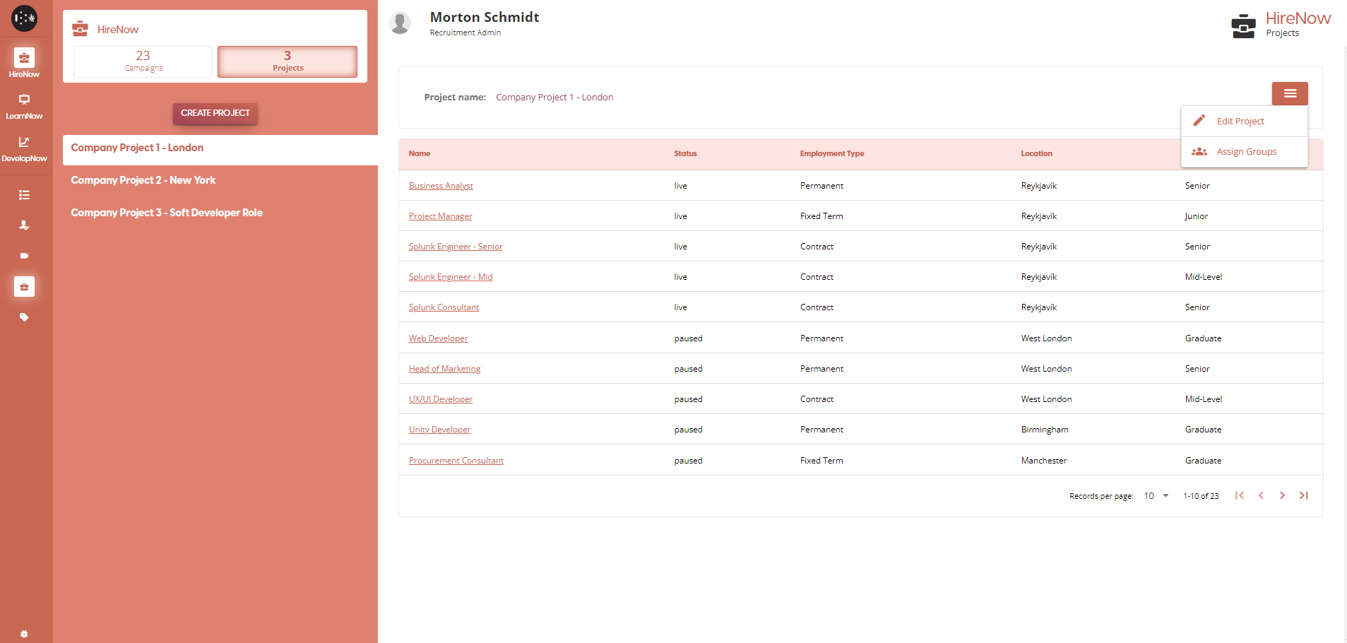 Once a project has been created, you can assign different recruitment teams to each of the projects. This controls who has visibility of the campaigns associated with the project. If a recruiter has not been assigned to a project, they will not be able to see any of the campaigns or applications from that project.