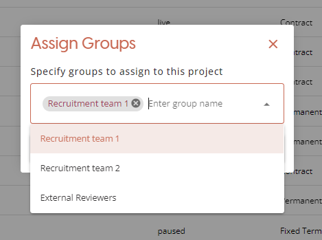 This will open the Assign Groups dialog. From here you can enter a search term to look for a particular group, or you can click on the dropdown to view all recruitment groups. Once you select a group, it will be added to the assigned groups list.