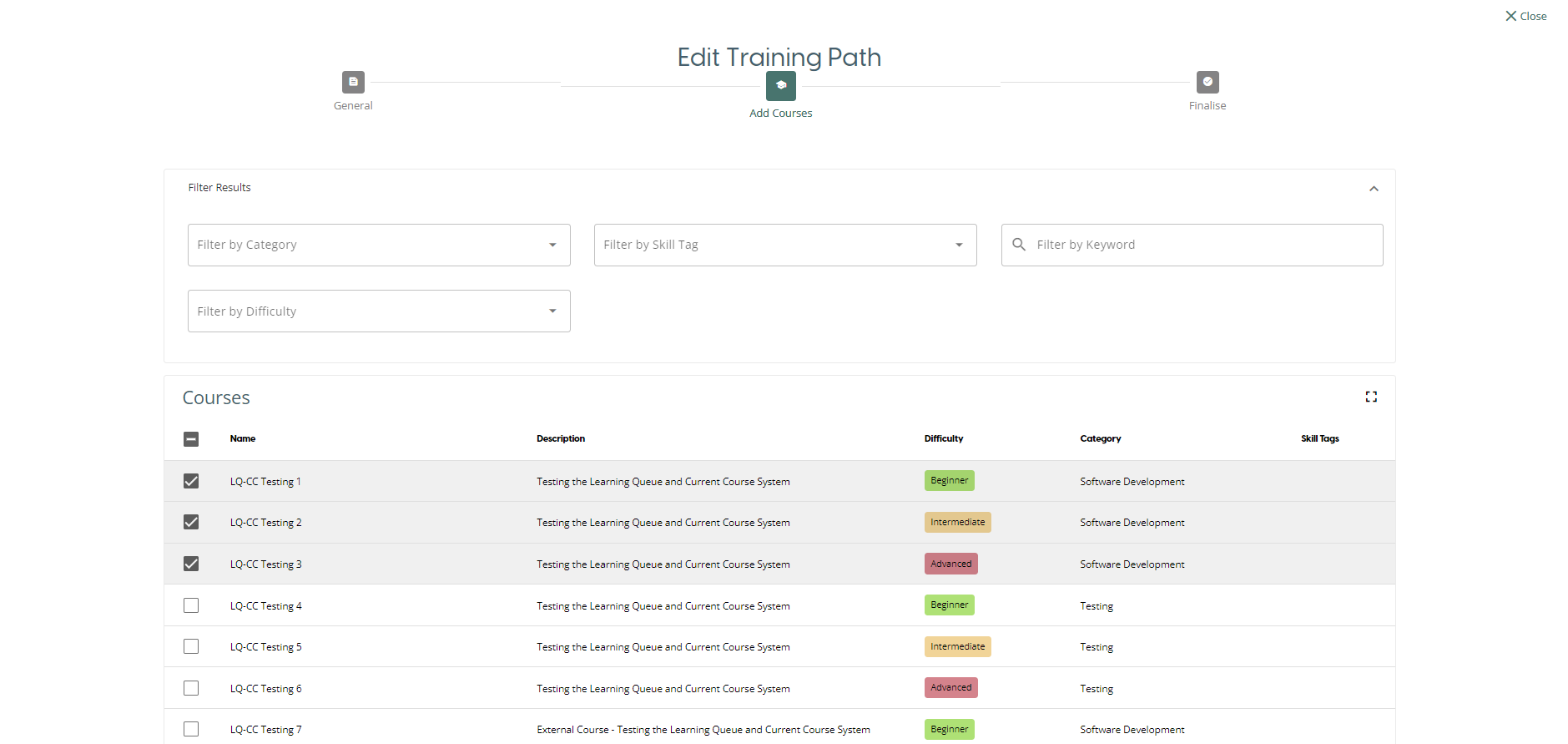 The next step in creating a training path is to assign courses to the path itself. The next view provides a list of the published courses. In order to add a course to a path, click on the course icon to select it and it will have a green tick to signify it has been selected. Clicking on the course again will untick it and remove it from the path. There is a Filter Results element that when clicked, expands to allow you to filter the courses in the view via different attributes.