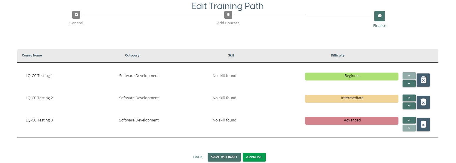 The final step in creating a training path is to finalise the courses in the path. The Finalise view provides a list of the courses that have been added to the path along with details of each course. The list is in the order that the courses were selected, so you can use the blue arrows to move a courses position in the list. The bin icon can be used to remove a course from the list. If you wish to keep the path in the Draft state, click the “Save as Draft” button. If you wish to publish the Training Path, pressing the “Approve” button will publish so it can be assigned to companies, teams or individuals.