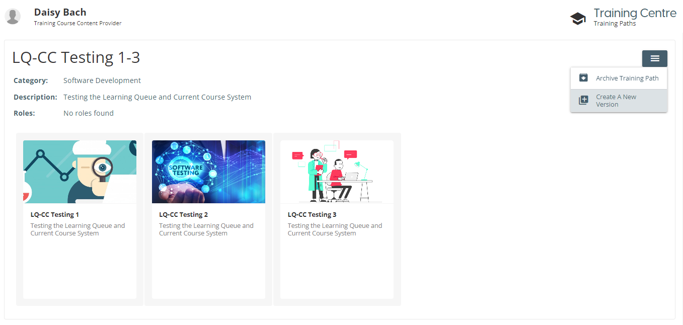 If the content of your training path changes after a training path has been published, you are able to create a new version of the training path. This feature allows you to modify the courses that are associated with the training path, and at the same time update the learning queues of the users who have already been assigned to the training path.