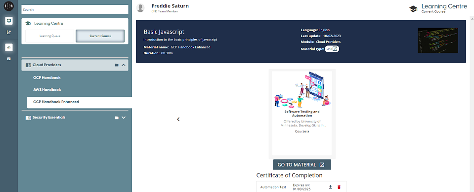 Once the user then clicks on upload, they will see a new section on the completed course page that displays then uploaded certificate and its expiry date. The icons allow the user to then download a copy of the certificate or to delete it.