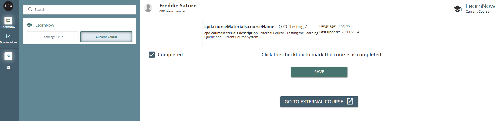 Once a user has finished an external course, they can check the course as completed and will be presented with a Save button to save their progress.