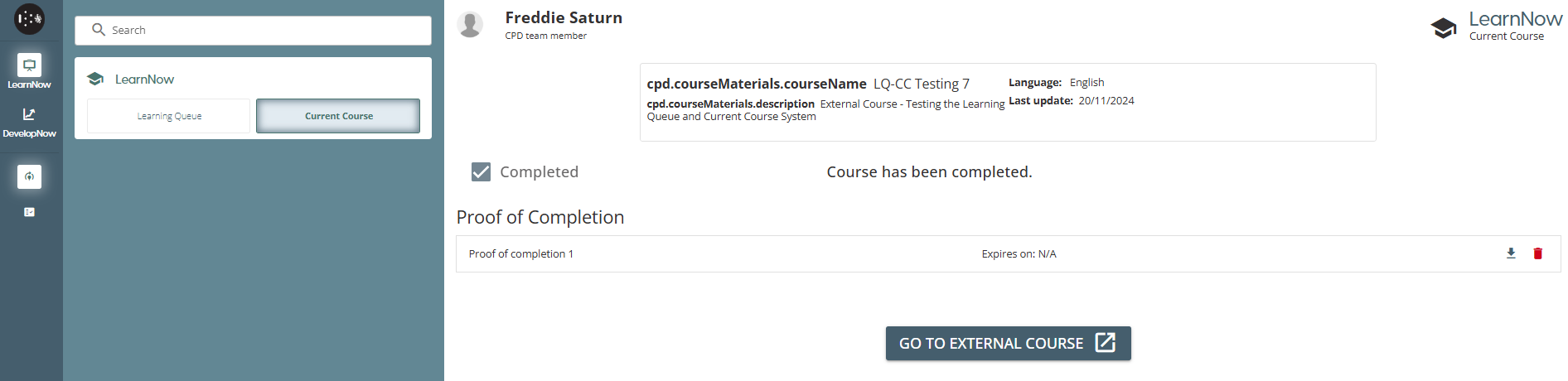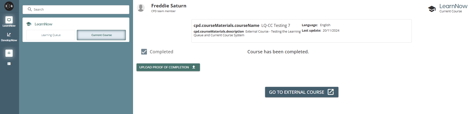As a company employee and team member when I have an external course in my assigned learning, I want to be able to upload a proof of completion.