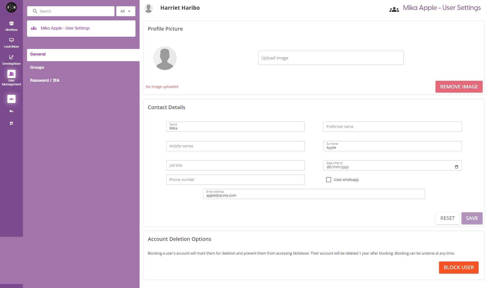 Account Deletion: Users cannot be deleted outright from the company as a company admin. Instead, you must first block the user via this page first. This will prevent the user from accessing SkillsNow, but will keep any information related to the user. After a year from the block date, the user will be deleted from the platform.