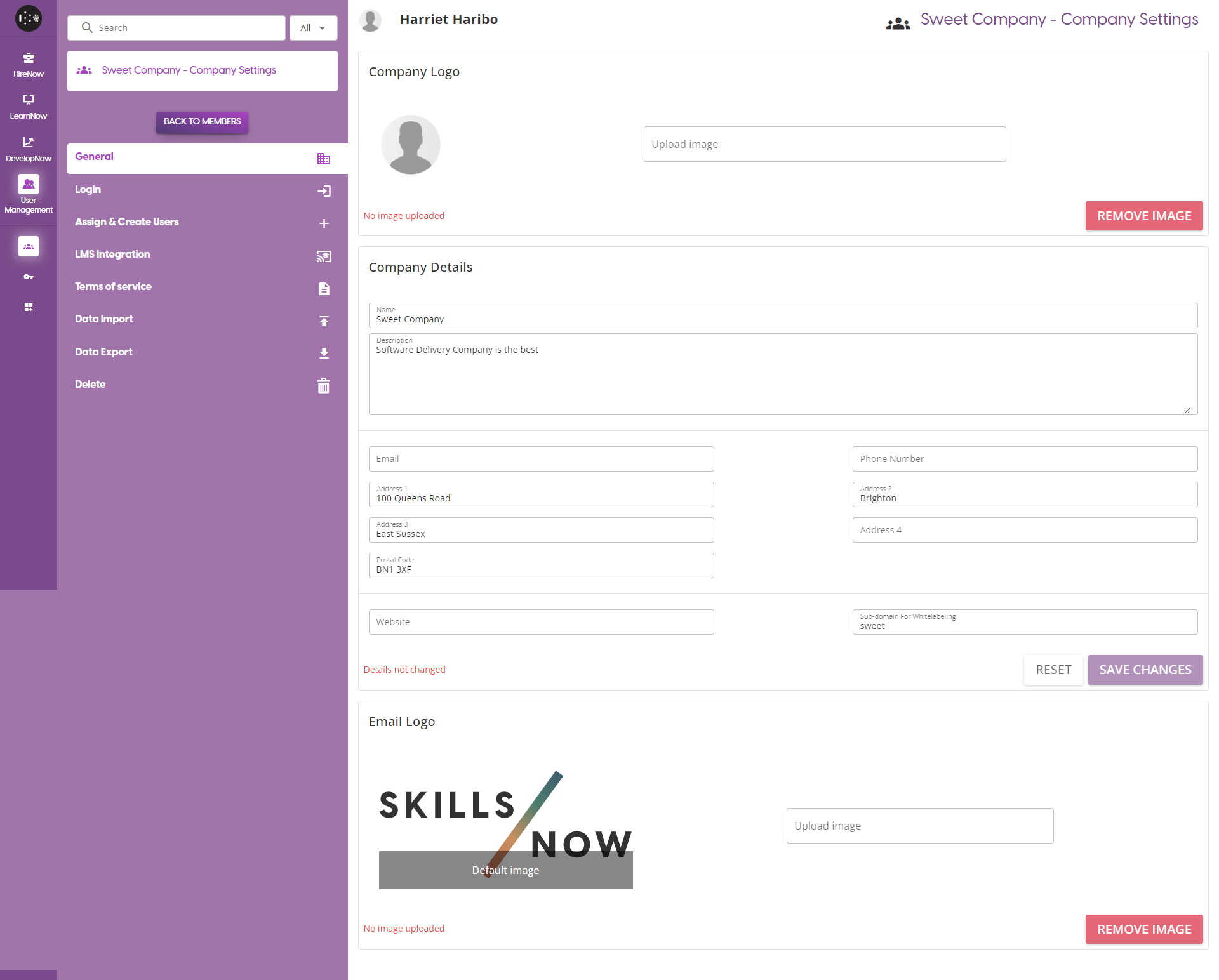 Company Details: Update any of the basic details of the company. To confirm any changes made, click on the 'Save Changes' button. Otherwise, click on the Reset button to clear any unsaved changes. Note that if you change the sub-domain for the website, users will not be able to access a wide range of features on the platform unless they go to a URL using the same sub-domain.