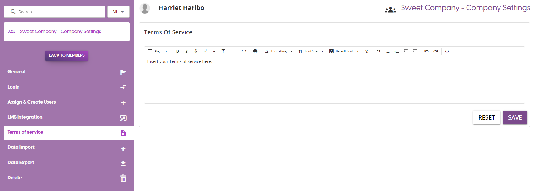 Update your terms of service, which can be accessed via the company login page or via the User Profile page.
